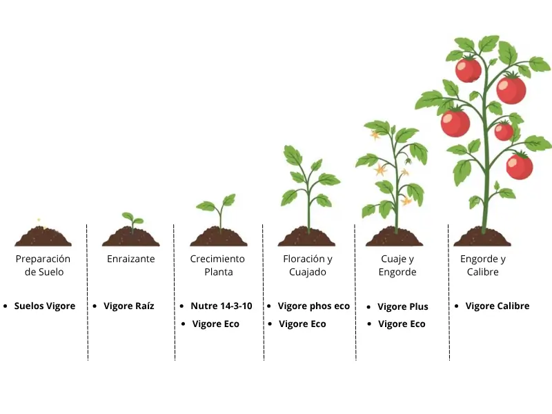 Desde la preparación y activación del suelo, pasando por el enraizamiento y el crecimiento vegetativo, hasta la floración, el cuajado y el engorde del fruto, encontrarás la secuencia completa de aplicación.